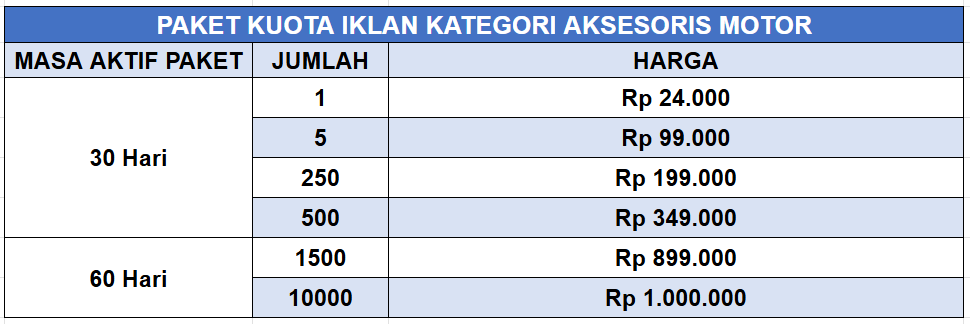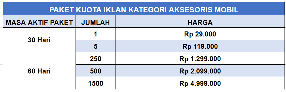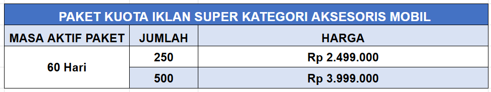 - Kuota Iklan Super: Kategori Velg dan Ban, Audio Mobil, Spare Part Mobil, & Aksesoris Mobil