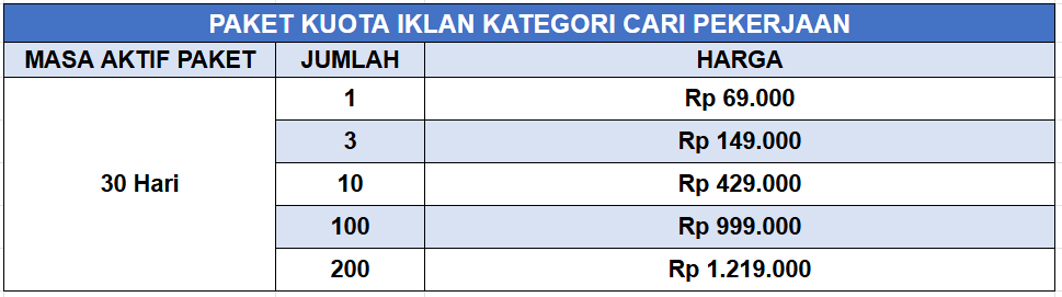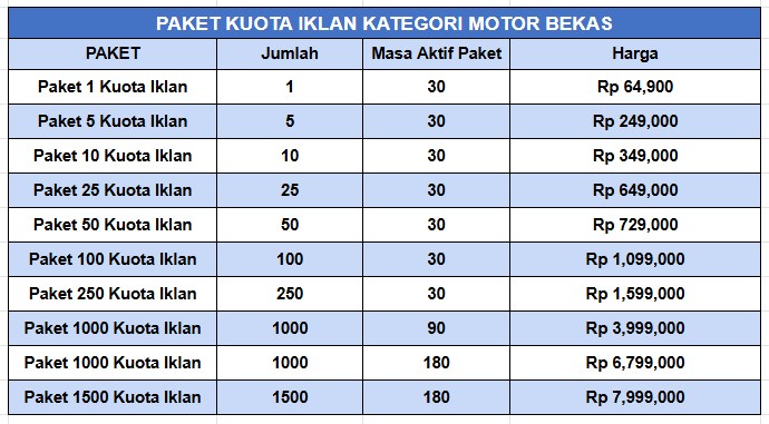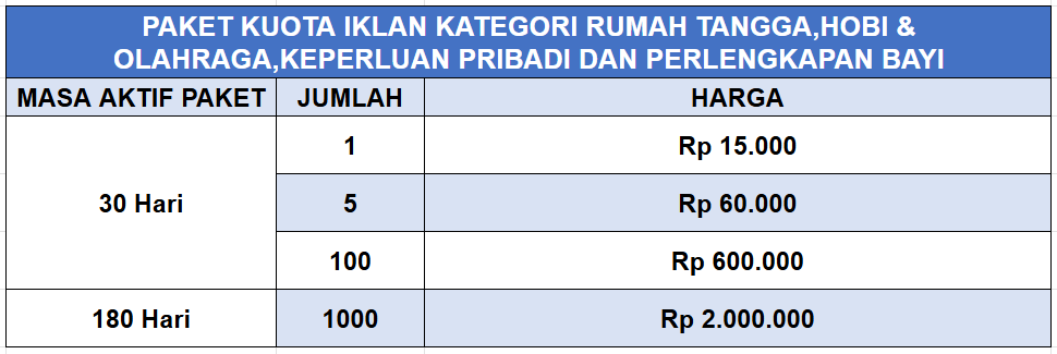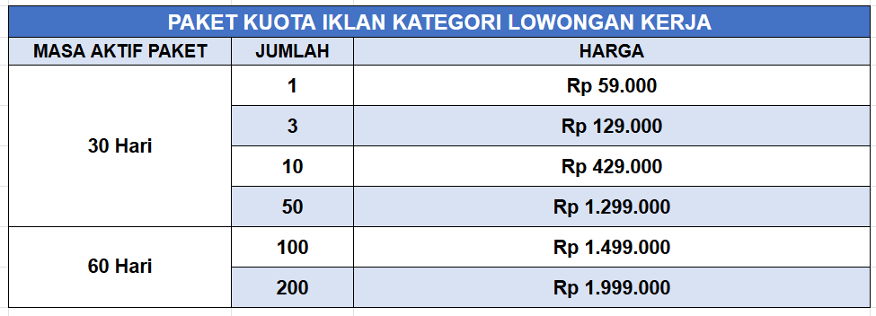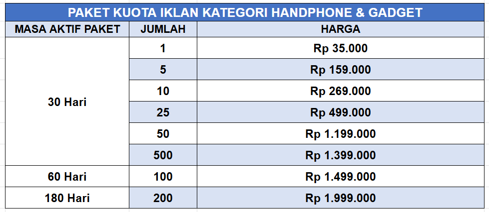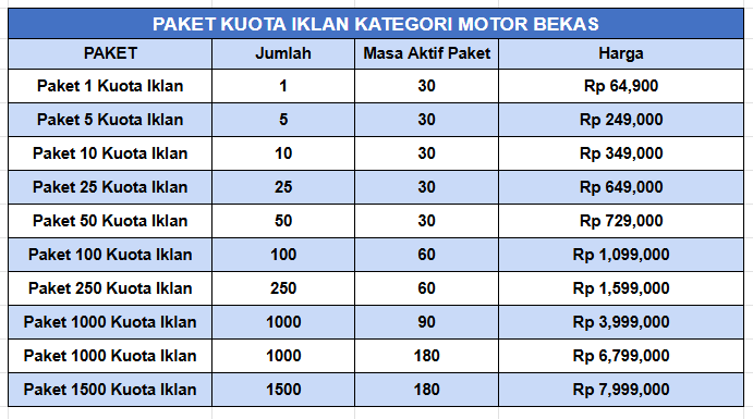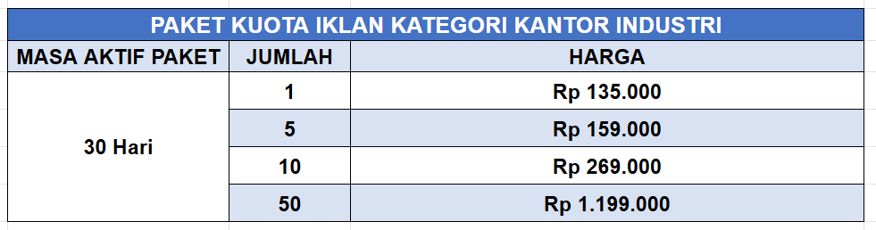 Kami telah menyediakan sejumlah pilihan paket Kuota Iklan yang dapat dipilih sesuai dengan kebutuhan pemasangan iklan Anda. Selengkapnya, dapat Anda lihat dibawah ini: